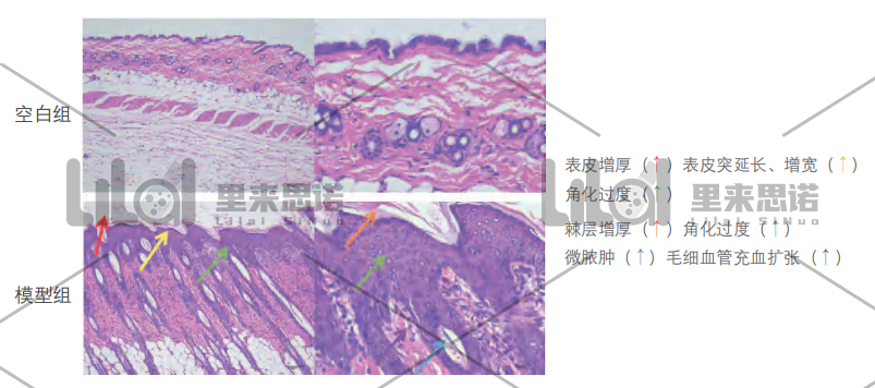 模型組皮膚組織結(jié)構(gòu)受損,部分表皮輕微壞死,表皮增厚較為明顯,棘層細(xì)胞層數(shù)明顯增 多,局部表皮突延長(zhǎng)、增寬,伸入真皮內(nèi),局部區(qū)域乳突上頂;表皮淺層角化過(guò)度、不全; 真皮膠原極少量中性粒細(xì)胞浸潤(rùn),局部毛細(xì)血管輕微充血擴(kuò)張。