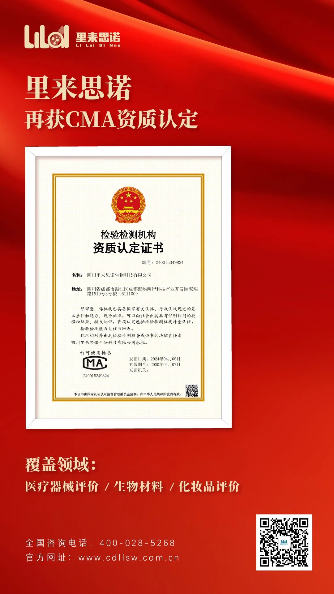經(jīng)過(guò)全員職工四年的持續(xù)努力,在成都醫(yī)學(xué)城管委會(huì)和成都醫(yī)學(xué)城實(shí)驗(yàn)室開(kāi)放聯(lián)盟的支持下,2024年4月8日,四川里來(lái)思諾生物科技有限公司再獲國(guó)家檢驗(yàn)檢測(cè)機(jī)構(gòu)資質(zhì)認(rèn)定(CMA)授權(quán)。此次擴(kuò)項(xiàng)后,公司在醫(yī)療器械和生物材料評(píng)價(jià)領(lǐng)域可完成符合GB/T、YY/T等國(guó)家或行業(yè)標(biāo)準(zhǔn)在內(nèi)的標(biāo)準(zhǔn)化檢驗(yàn)檢測(cè)評(píng)價(jià)服務(wù),可提供生物材料和醫(yī)療器械的可行性、安全性、有效性性等一體化臨床前研發(fā)服務(wù)。