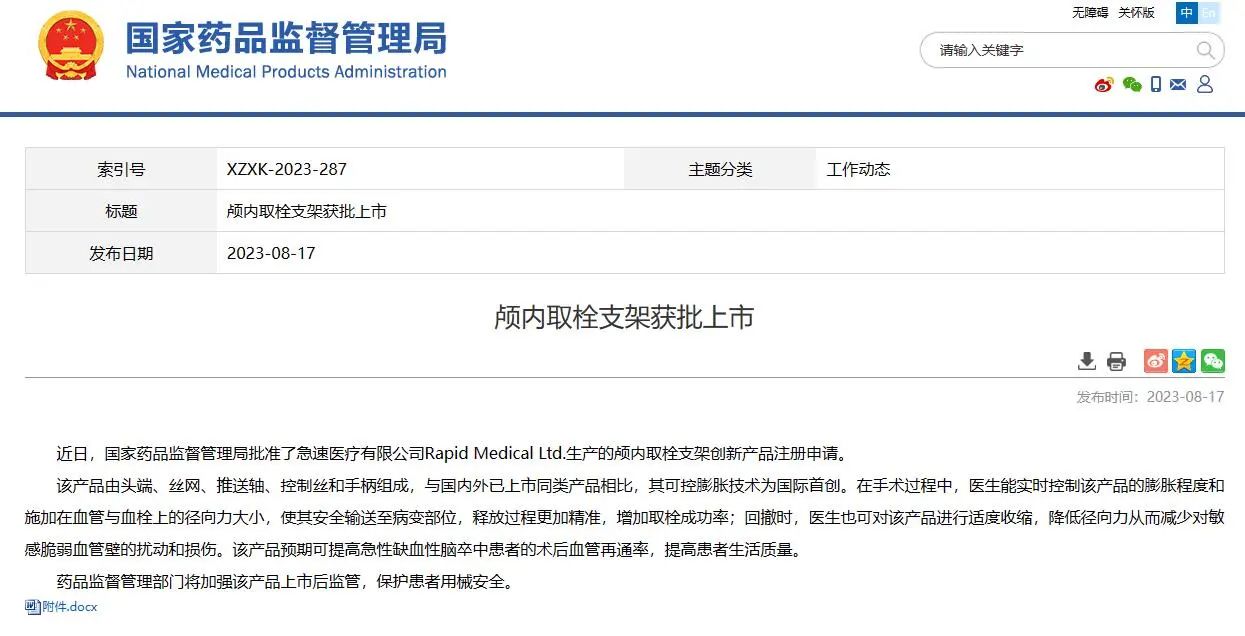 近日,國家藥品監(jiān)督管理局批準(zhǔn)了急速醫(yī)療有限公司Rapid Medical Ltd.生產(chǎn)的顱內(nèi)取栓支架創(chuàng)新產(chǎn)品注冊申請。