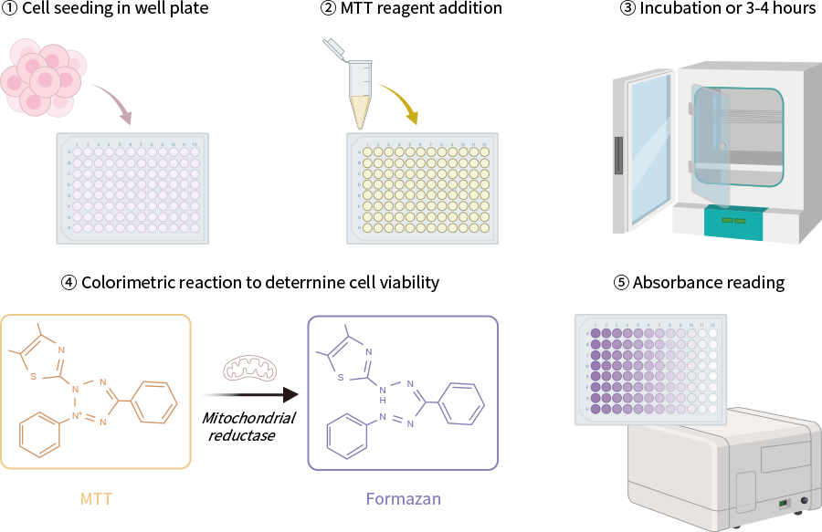 MTT即噻唑藍(lán),是一種可接受氫離子的黃色有機化合物,可以被活細(xì)胞線粒體內(nèi)的琥珀酸脫氫酶和細(xì)胞色素C等還原為不能溶于水的藍(lán)紫色產(chǎn)物甲臜(formazan)。該產(chǎn)物雖然不溶于水,但可以溶于特定溶劑(如DMSO)。